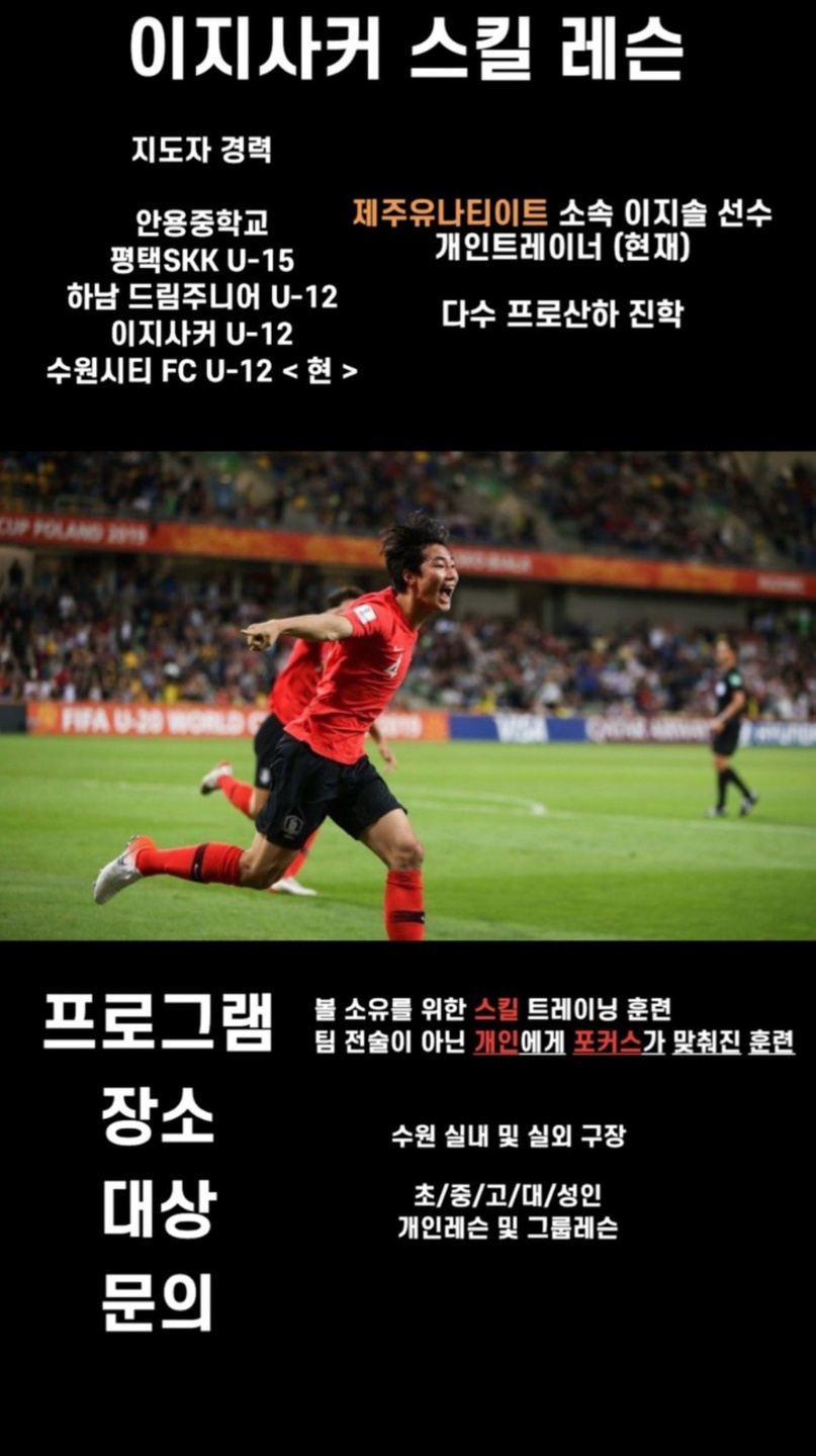 엘리트 축구 레슨을 진행합니다 초중고 100분 레슨을 실시하고 있는 경기 중에 대해서. 선수 포지션별로 레슨을 진행하며 개인별 장단점을 파악하여 선수들에게 더 나은 프로그램을 실시하오니 많은 문의 부탁드립니다. 010.5965.6605 #수원 #화성 #축구레슨 #스킬 #경기력향상 #안산 #멘토링엘리트축구레슨을 진행합니다 초중고 100분 레슨을 실시하고 있는 경기 중에 대해서. 선수 포지션별로 레슨을 진행하며, 개인별 장단점을 파악하여 선수들에게 더 나은 프로그램을 실시하오니 많은 문의 부탁드립니다. 010.5965.6605 #수원 #화성 #축구레슨 #스킬 #경기력향상 #안산 #멘토링